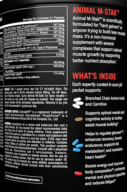 Each pack contains 8000 mg of active ingredients to support the creation of lean muscle mass. Animal M-Stak contains the newest flavone and phytoecdysterone complex, featuring three newly - developed active ingredients that have become available to bodybuilders: Methoxy, Ecdysterone and Ipriflavone. Methoxyisoflavone and Ipriflavone are isoflavones that have an extraordinary effect on the increase of quality muscle mass in bodybuilders and heavy athletes.