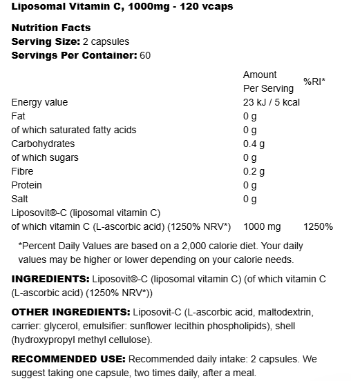 Food supplement in the form of a hard capsule containing liposomal vitamin C (Liposovit -C). The liposomal form is gentle on the stomach and better absorbed by the body.