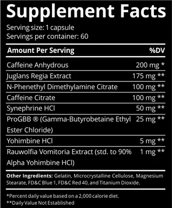 Yohimbine HCL 5mg & Alpha Yohimbine 1mg make this a potent fat loss duo with research backing its efficiency in boosting metabolism and burning fat. GBB is added to the mix to further the diuretic nature of stimulants plus aid even more thermogenesis.