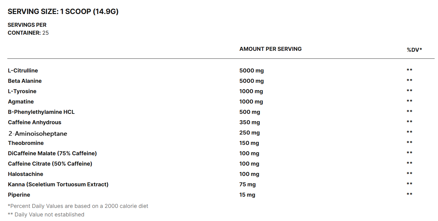 Dicaffeine Malate (75% Caffeine): 100 mg to complement the caffeine anhydrous, giving you sustained energy release that helps avoid the dreaded post-caffeine slump.