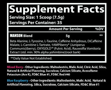 The Manson Family of pre-workout products will lead you to kill your workout - over and over again. Three great-tasting formulas will make it obvious to you why Manson had so many adoring fans that we brought it back!