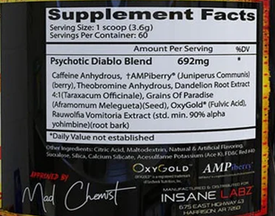 INSANELY FORMULATED. Psychotic Diablo is clinically formulated with Theobromine Anhydrous to boost cognitive function, Dandelion Root Extract to decrease water retention, Grains of Paradise to target visceral fat, and our patented AMPiberry and OxyGold to increase absorption and provide clean energy.