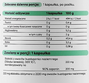 Our food supplement contains Tribulus terrestris fruit extract standardised to 90% saponins. The daily serving is 1 capsule providing 220 mg of extract, equivalent to 2220 mg of raw plant material, delivering 200 mg of saponins. The product has been developed in line with current guidelines for the use of Tribulus fruits in Poland.
