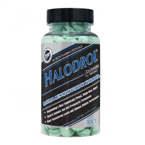 Hi-tech Pharmaceuticals Halodrol to produkt sterydowy przeznaczony dla sportowców w celu zwiększenia masy mięśniowej. Produkt skraca czas regeneracji po treningu i zwiększa wytrzymałość mięśni. Ponadto zwiększa krążenie krwi i zapobiega gromadzeniu się wody w organizmie. Halodrol jest zalecany dla każdego, kto chce uzyskać znaczną masę mięśniową. Sposób jego działania jest podobny do testosteronu. Zawiera 250 mg mieszanki: 1-androstene-3b-ol, 17-one (1-Andro). 1-androstene-3b-ol odpowiada za duży przyrost masy mięśniowej, a 1-Andro to prohormon energetyczny, który bierze udział w powstawaniu 1-testosteronu. Efektem przyjmowania 1-Andro jest wysoki przyrost masy mięśniowej i zwiększona produkcja testosteronu. 4-Andro, podobnie jak 1-Andro, bierze udział w konwersji do testosteronu. Mieszanka 4 związków, które przekształcają się w silne anaboliki jest o 200% bardziej anaboliczna niż testosteron. Niewątpliwie jest to jeden z najlepszych suplementów zwiększających beztłuszczową masę mięśniową i siłę.