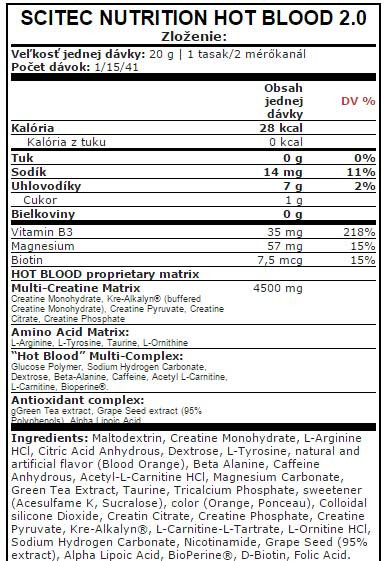 ORANGE JUICE FLAVORED: maltodekstryna, monohydrat kreatyny 13.6%, dekstroza, chlorowodorek L-argininy, beta-alanina, substancja wypełniająca (polidekstroza), L-cytrulina, L-tyrozyna, kwas (kwas cytrynowy), aromat, kwas (kwas jabłkowy), cytrynian sodu, sole wapniowe kwasu ortofosforowego, węglan magnezu, substancja przeciwzbrylająca (dwutlenek krzemu), kofeina bezwodna 1.1%, acetylo-L-karnityna, substancje słodzące (acesulfam K, sukraloza), tauryna, ekstrakt z liści zielonej herbaty, L-glutamina, preparat paprykowy [maltodekstryna, substancja utrzymująca wilgoć (glicerol), ekstrakt z owoców papryki, emulgator (estry kwasu cytrynowego z mono- i diglicerydami kwasów tłuszczowych), przeciwutleniacze (estry kwasów tłuszczowych z kwasem askorbinowym, alfa-tokoferol), olej słonecznikowy], preparat z ekstraktu guarany [ekstrakt z nasion guarany, maltodekstryna, kofeina], kwas L-askorbinowy, ekstrakt z kłącza imbiru, chlorowodorek L-ornityny, L-leucyna, regulator kwasowości (węglany sodu), β-hydroksy-β-metylomaślan wapnia, Carnipure® L-winian L-karnityny 0.2%, Ginkgo Biloba ekstrakt z liści, bisglicynian cynku, nikotynamid, preparat octanu DL-alfa-tokoferylu [octan DL-alfa-tokoferylu, substancja przeciwzbrylająca (dwutlenek krzemu)], L-walina, L-izoleucyna, dwuwinian choliny, ekstrakt z pestek winogron, chlorowodorek L-lizyny, betaina, kwas nikotynowy, preparat octanu retinylu [stabilizator (guma arabska), octan retinylu, przeciwutleniacz (alfa-tokoferol), substancja przeciwzbrylająca (fosforany wapnia)], BioPerine® ekstrakt z owoców pieprzu czarnego 0.007%, chlorowodorek pirydoksyny, D-biotyna, kwas pteroilomonoglutaminowy, pikolinian chromu, cyjanokobalamina. Wyprodukowano w zakładzie produkującym mleko, jaja, gluten, soję, orzeszki ziemne, orzechy, seler, ryby, skorupiaki, mięczaki i żywność zawierającą dwutlenek siarki.